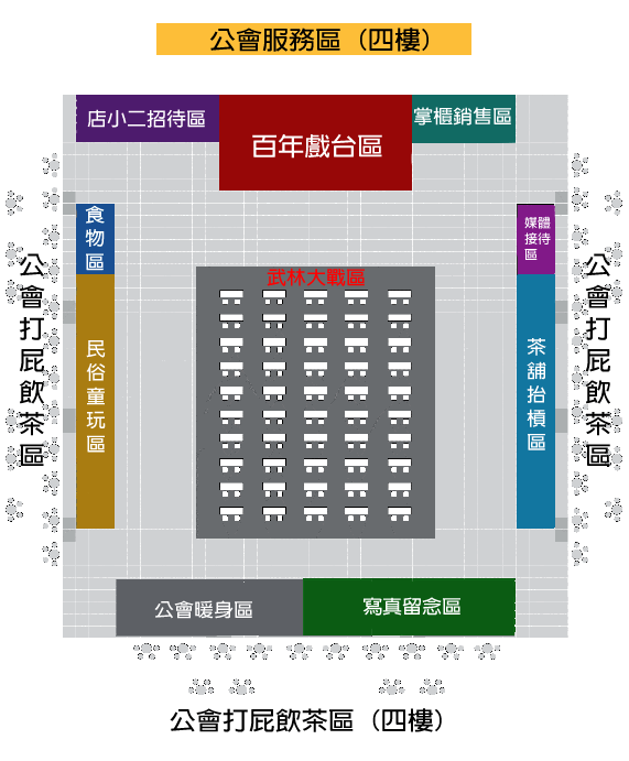 *公會打屁飲茶區: 於四樓看台,提供免費奉茶點服務,玩家可輕鬆品茶聊天看戲抬槓。 |