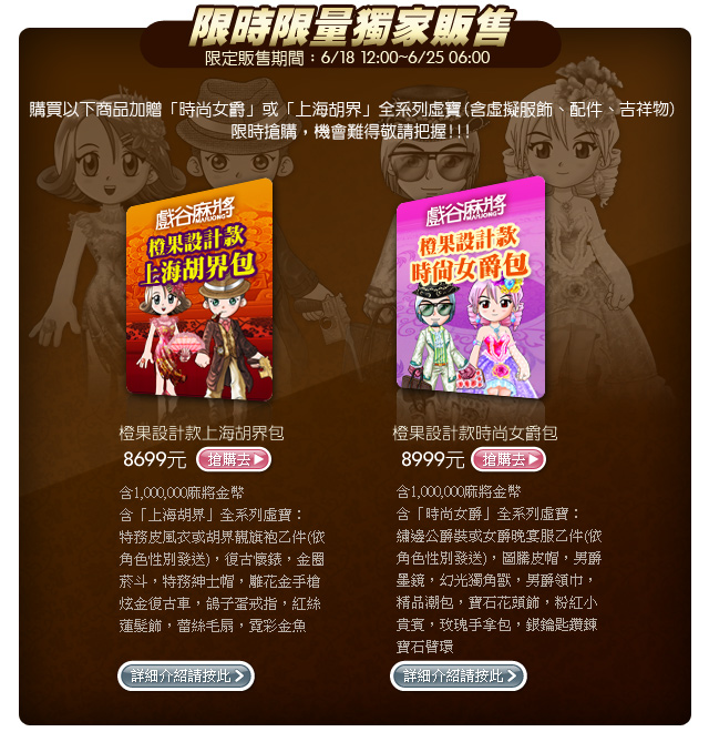 ※ 請注意:橙果設計款時尚女爵包與上海胡界包贈送之系列虛寶統一於6/25 24:00前發送至玩家帳戶中