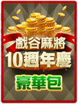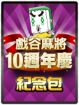 | 【麻將10週年紀念包】 優惠價 999元 產包內含麻將金幣110,000金幣、 兌換券1張 【麻將10週年紀念包】 |